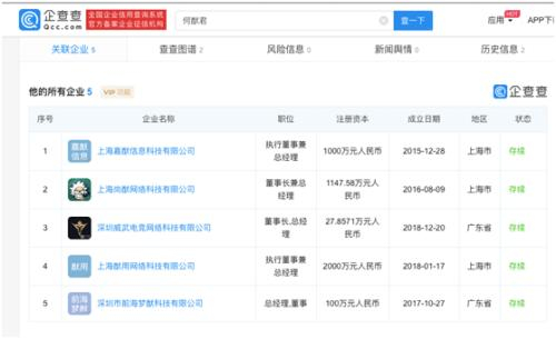 奚梦瑶名下4家公司 企查查数据显示与何猷君暂无工商联系