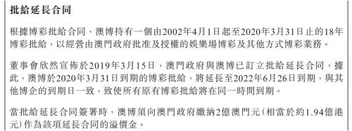 澳博控股持有一张由2002年4月1日起至2020年3月31日止的18年博彩赌牌,3月15日,澳门政府与澳博签订了批给延长合同,将延长至2022年6月26日到期,与其他博企的到期日一致。