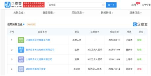 企查查数据显示:奚梦瑶名下共有4家企业,均为文化传媒公司。其中一家已注销。