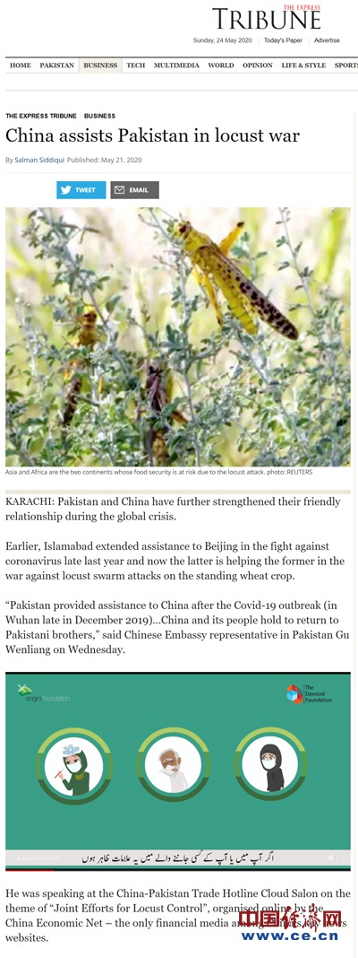“中巴经贸热线云沙龙-联手治蝗”于5月20日中巴建交69周年前夕举行,巴基斯坦媒体《黎明报》(Dawn)、《国民报》(The Nation)、《论坛快报》(Express Tribune)、《国际新闻》(The News International)等跟进报道。