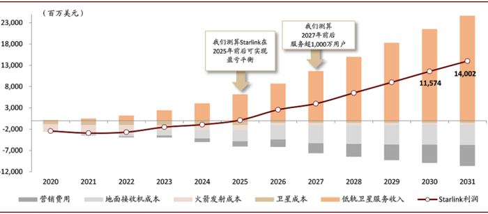 我们认为卫星互联网的主要商业机会包括(1)卫星互联网+电动车,加速智能驾驶发展;(2)卫星互联网+传感器,加速能源、工业等行业物联网发展;(3)政府、海事、飞机等企业专网的宽带数据升级。在各国低轨星座的推动下,据Statista预计,全球航天经济规模到2030年将达到约6,000亿美元;其中,基于卫星互联网的卫星宽带市场将增至460亿美元、2020-2030年之间增长5倍,衍生应用市场将增至990亿美元、2020-2030年增长约100倍,为全球商业航天及应用服务企业提供广阔发展空间。我们测算,SpaceX的星链计划,如果能在2020年完成第一批1600颗卫星的部署并开始商业服务,有望在2025年前后实现盈亏平衡,到2027年成为全球服务超过1000万用户的卫星互联网运营商。