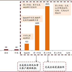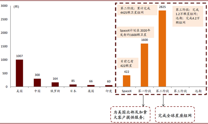 Elon Musk于2015年首次提出“星链计划”。该计划共分两期三阶段,计划发射总共1.2万颗卫星到550-1325公里之间的多条绕地轨道,形成一个可以覆盖全球的宽带卫星通信网络,并在2019年将卫星总规模扩大至4.2万颗。SpaceX从2019年5月开始卫星发射,截止2020年5月18日,已经成功发射7次合计422颗卫星入轨(含试验星),从拥有卫星数量上来看,已经成为全球最大卫星运营商之一。按照目前每隔2~3周进行一次“一箭60星”发射的速度,我们预计SpaceX到2020年底将拥有约1600颗卫星,比截至2019Q3的任何国家的卫星数量都要多。
