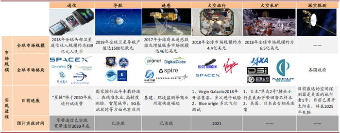 传统的航天应用以卫星为主,包括通信、导航、遥感、科研四大方向。随着商业航天的兴起,产生了新的方向,在卫星通信领域出现了卫星互联网,以及太空旅行、太空采矿、深空探测等。更长期的如建设太空基地、移民火星等,也是人类航天技术未来可能的发展方向。