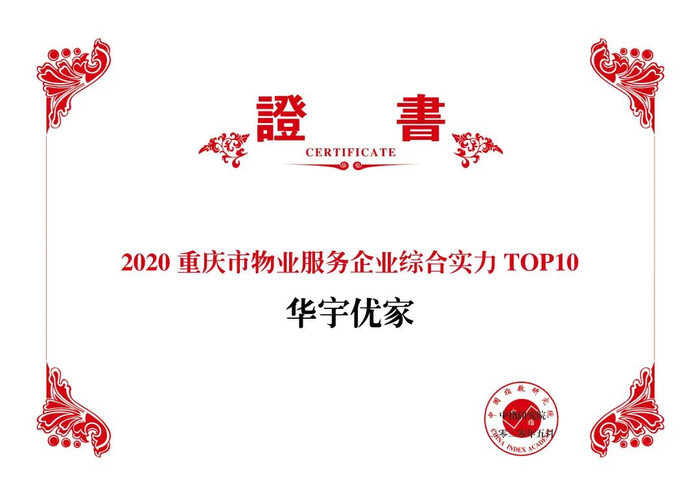 2020年5月13日,由中指研究院、中国房地产TOP10研究组主办,中指控股(CIH)、中指研究院承办的“2020中国物业服务百强企业研究成果发布会暨第十三届中国物业服务百强企业家峰会”隆重举行。大会发布了2020中国物业服务百强企业研究成果,华宇优家智慧生活服务集团有限公司荣获“2020中国物业服务百强企业”荣誉,位列百强第25名,这已是华宇优家连续第五年蝉联中国物业服务百强企业,此外,华宇优家还荣获了“2020中国物业服务百强企业成长性领先企业”“2020中国特色物业服务领先企业-钻石优管家服务”“2020重庆市物业服务企业综合实力TOP10”等奖项。