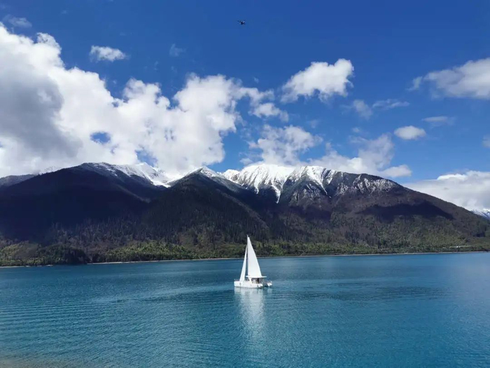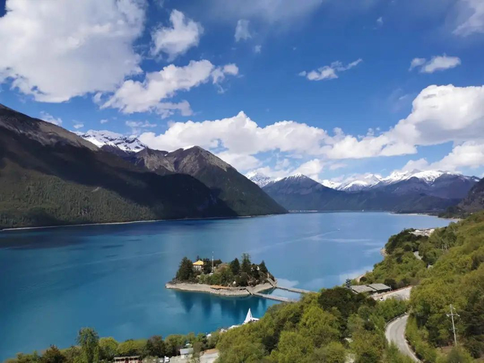 这里还可以乘帆船泛游在巴松措蔚蓝的湖面上,四周雪山环伺、林木葱茏,湖心岛上的古寺白塔隐约可见,湖畔还修建有各式漂亮的建筑,若登高远望,不远处的村庄田野,在这雪山湖水间宁静而美好。