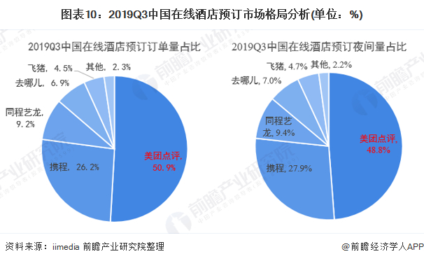 从在线酒店预订市场来看,根据iimedia数据,2019年第三季度美团点评的在线酒店预订量占总订单量的50.9%,高居首位;而携程系(携程+去哪儿)的占比仅为33.1%;同时2019第三季度美团酒店间夜量占比达48.8%,也位居行业第一。总体来看,美团酒店于在线酒店预订市场已经超越携程,成为第一。