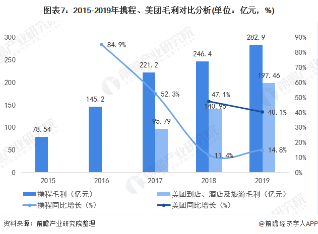 具体从经营收入来看,携程的营业收入远超于美团的到店、酒店及旅游收入,但美团的经营增速处于较高水平,说明美团在旅游相关业务方面正加速布局。2019年携程的营业收入为356.7亿元,同比增长15.2%;而美团到店、酒店及旅游收入仅为222.75亿元,同比增长40.6%。