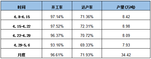 春节后很多企业受疫情影响,延迟复产复产。3月初开始,前期停产检修企业逐步恢复,大都是民营企业。为满足下游制罐企业需求,部分企业加足马力生产。截止5月6日,Mysteel对国内23家具备规模的马口铁生产企业调研,调研数据显示:整体开工率93.16%,周环比降3.21%;产能利用率69.33%,周环比降1.39%;周产量7.93万吨,4月产量合计34.42万吨。(调研样本说明:23家镀锡生产企业共涉及产能580万吨,占全国产能77%,现调研涉及产线43条,占全国产线82.69%)。