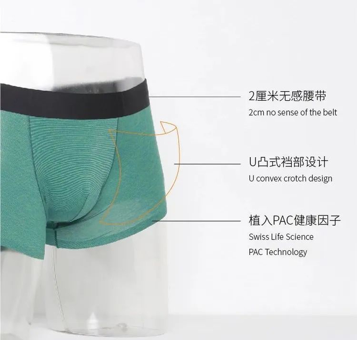内裤采用植物染色,健康不刺激。同时,棉芙还将PAC健康因子移植到内裤上,提高了内裤的抗菌能力,避免异味尴尬。