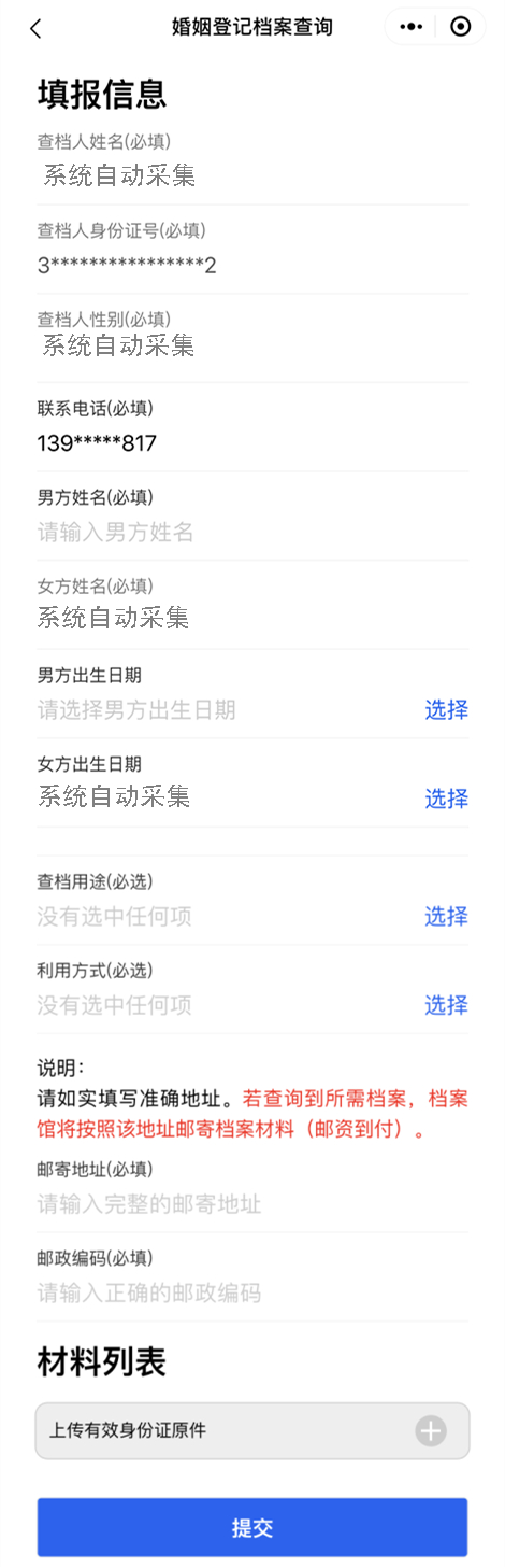 注:提交成功后,请保持电话畅通,档案馆将在两个工作日内通过电话审核查档申请,审核完成后,档案馆将根据已填写的地址邮寄档案材料。