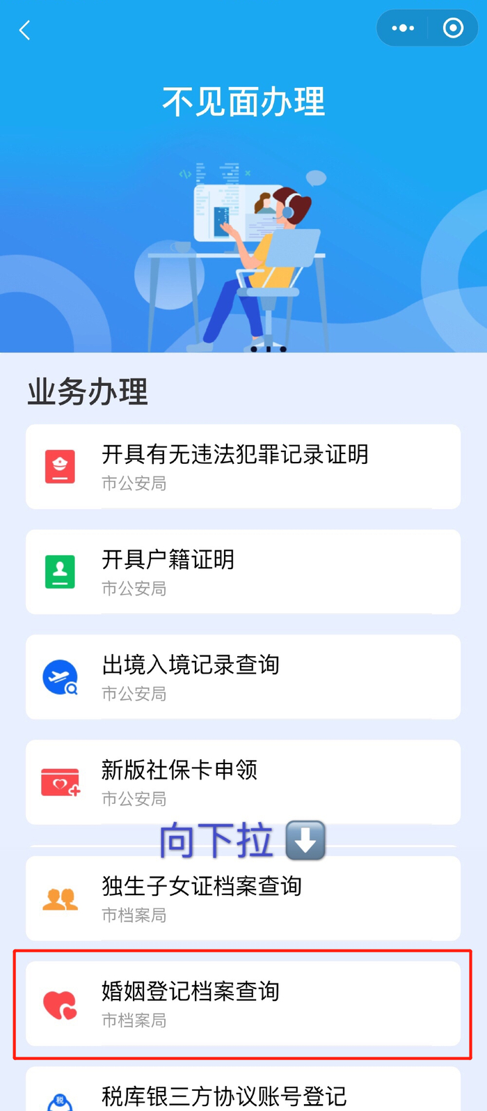 下拉找到“婚姻登记档案查询”
