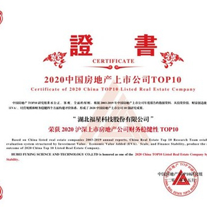 2020年5月13日,由中国房地产TOP10研究组主办,中指控股(CIH) 、中指研究院承办的“2020中国房地产上市公司研究成果发布会暨第十八届中国房地产投融资大会”隆重召开。其中,湖北福星科技股份有限公司蝉联“沪深上市房地产公司财务稳健性TOP10”,并再次获得“2020值得资本市场的房地产公司”称号。