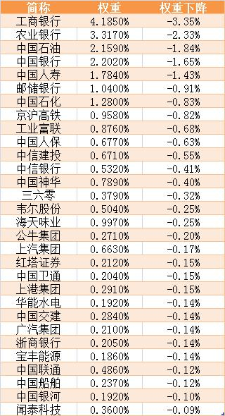 按照上证流通指数方式调整后,工商银行、农业银行、中国石油、中国银行、中国人寿、邮储银行(601658)、中国石化、京沪高铁(601816)、工业富联(601138)、中国人保(601319)10只股票权重下降最大,其中工商银行、农业银行、中国石油、中国银行、中国人寿权重均下降1个百分点以上。(权重对应现上证指数权重)