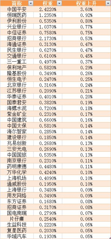 权重上升最大的10只个股分别是中国平安、恒瑞医药、伊利股份、兴业银行、中信证券、招商银行、海通证券、民生银行、交通银行、三一重工(600031)。中国平安权重上升3.6个百分点,恒瑞医药、伊利股份权重分别上升0.92个百分点和0.8个百分点;兴业银行、中信证券、招商银行权重上升0.5个百分点。(权重对应现上证指数权重)