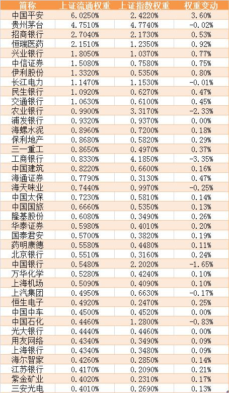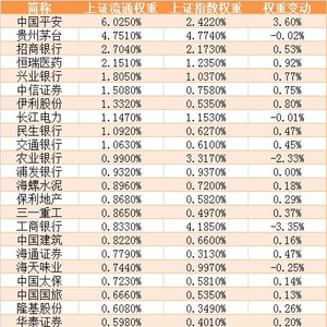 从个股权重看,目前上证指数前10大权重股分别为贵州茅台、工商银行、农业银行中国平安、中国银行、招商银行、中国石油、中国人寿(601628)、中国石化、恒瑞医药,如果按照上证流通指数方式加权,工商银行、农业银行、中国人寿、中国石化、中国石油、中国银行将被挤出10大权重股行列,交通银行、民生银行、兴业银行、伊利股份、长江电力、中信证券将进入10大权重股行列。