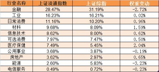 相对于上证综指,上证流通指数的行业权重变化最大的是: