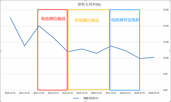 这种经营模式需要满足A预判的子赛道精准B消费电子处在高景气成长区间C大规模的产能扩张和价格战;其结果是单双摄业务押对赛道,取得龙头地位;电容屏同样在2012-2015享受行业红利并赢下价格战,但也在2018年产能过剩遭遇存货减值大幅计提的危机;对于不同经营模式的移动互联网、技术护城河高的液晶显示模组业务则没有得逞,而智能驾驶业务则仍然等待其是否会大规模投入并进行验证。