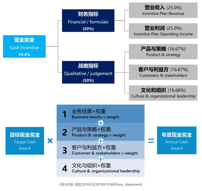 自2014年初CEO换帅后,经过几个月的内部沟通,2015年微软明确了企业愿景和新的战略方向,紧跟着薪酬委员会牵头重新设计高管薪酬框架,2016年同步推出全新的“按绩效授予”的高管薪酬计划。这项激励设计与微软当时的战略转型——“从传统产品导向、高效率的企业,转型为创新、包容的平台型企业”是完全匹配、相互支撑的。