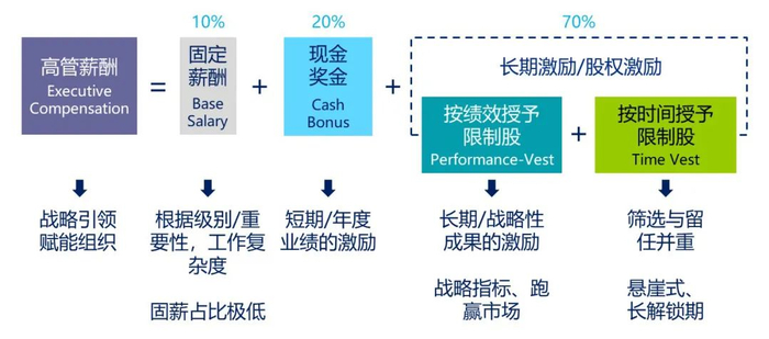 股权激励是微软高管薪酬的重头(73%),其设计尤为巧妙缜密:一半是“按绩效授予”的限制股,3年锁定期考核战略里程碑的落地情况,3年后一次性解锁,激励力度非常强;另一半限制股是“按时间授予”,细水长流的解锁模式,达到很好的绑定留人效果,激励、留人两者兼顾。