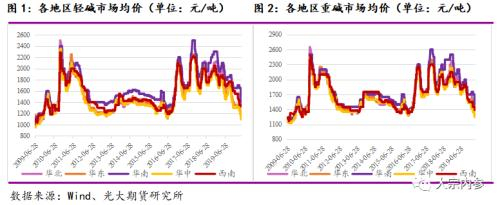 1、现货价格跌至近几年新低位置。自2006年初以来,国内重质纯碱市场价格波动区间范围在1110~2529元/吨,轻质纯碱价格波动范围在1080~2370元/吨。而截至2020年5月22日,国内重质纯碱市场中间价格1361元/吨,轻质纯碱市场中间价格仅为1271元/吨。现货市场中间价目前已跌至有数据统计以来的底部区间,部分地区轻、重碱价格已达到近10年来的低点,且短期市场很可能继续探底。