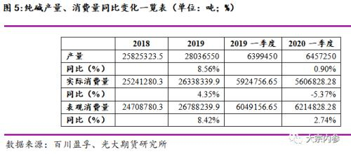 2020年第一季度,国内纯碱产量同比增速0.9%,实际消费量同比增速-5.37%。2020年初国内新冠肺炎疫情蔓延导致纯碱行业停摆,生产、流通、消费均受到较大冲击,全面复工以后,下游也未能快速恢复正常,消费持续萎缩继续拉大消费增速和产量增速的差距,从而导致2020年上半年供需失衡状态不断深化。