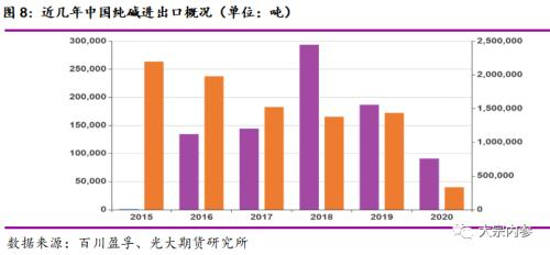 国际市场的新增低成本产能、国外新冠肺炎疫情持续恶化不断挤压我国纯碱出口市场份额,未来我国出口或将继续萎缩,进口低成本碱数量或将继续增加。如此一来,我国出口份额转至国内库存堆积,变相增加国内供应。再加上纯碱进口目前保持相对正常状态,而国内低迷价格冲击纯碱外贸市场,造成国内、国际价格双低局面。