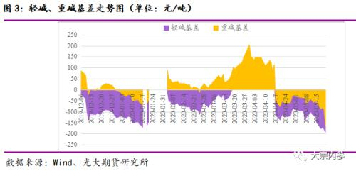 2、纯碱期货价格处于深度升水状态。截至5月22日,重碱基差-61元/吨,轻碱基差将近-151元/吨。数据显示,自纯碱期货上市以来,重碱基差范围在-89~204元/吨,轻碱基差波动范围在-179~125元/吨。目前期货价格升水程度达到纯碱期货上市以来的相对高位。