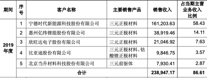 报告期内,该公司前五大客户销售金额占当期主营业务收入的比例分别为63.68%、72.41%和86.61%,其中对宁德时代及其下属企业销售金额占当期主营业务收入比例分别为25.03%、36.49%和58.43%,呈逐年走高趋势。值得注意的是,在报告期内,宁德时代一直位居长远锂科前五大客户名单之首。