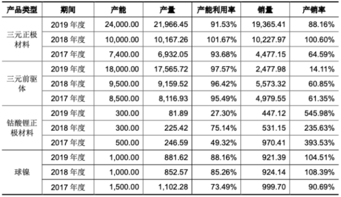 然而,从长远锂科招股书披露的产能和产销情况来看,报告期内,其三元正极材料的产能利用率分别为93.68%、101.67%和91.53%,产销率分别为64.59%、100.60%和88.16%,两项指标2019年数据较2018年均有所下降。长远锂科在招股书中解释称,下降主要因为该公司三元正极材料产量不断爬坡,同时在2019年四季度下游客户推迟交货安排致使期末库存有所增加所致。