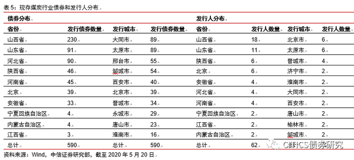 在现存的信用债中,筛选出Wind行业中属于煤炭开采行业的债券,共计590只,发行人共计62家。从债券数量角度看,山西省、山东省、河北省、陕西省、河南省的现存债券较多;从发行人角度看,山西省、山东省、陕西省、北京、安徽省的发行人数量较多。