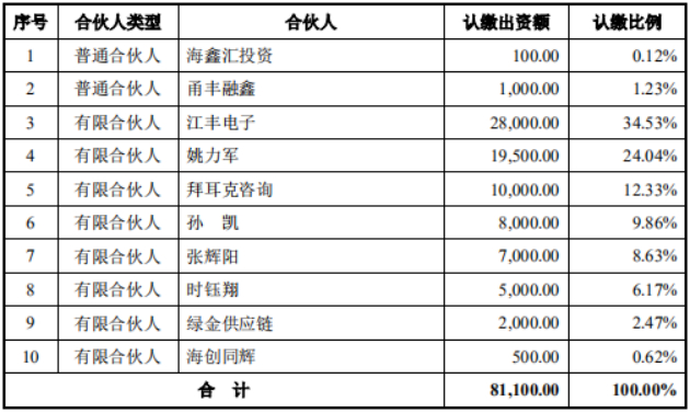 2018年12月25日,江丰电子与海鑫汇投资、甬丰融鑫、姚力军、拜耳克咨询、绿金供应链、张辉阳、时钰翔、孙凯、海创同辉签署合伙协议,共同出资设立共创联盈。共创联盈成立时的出资结构如下图所示。在2018年度报告中,江丰电子披露共创联盈为其联营公司。