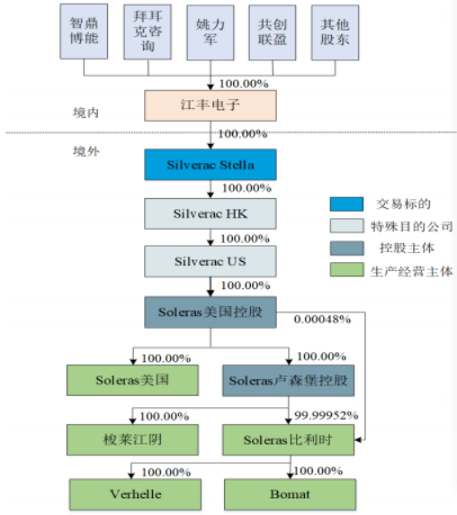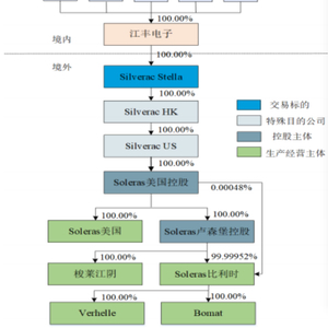 重组完成后,Silverac Stella将成为江丰电子的全资子公司,江丰电子通过Silverac Stella间接持有最终标的Soleras美国控股(全称为Soleras Advanced Coatings Ltd),即Soleras比利时、Soleras美国和梭莱江阴及其子公司在内的全部生产经营主体100%股权。本次重组的实质即为江丰电子通过收购Silverac Stella实现对Soleras美国控股下生产经营主体的控制,重组后的控制权结构如下图所示: