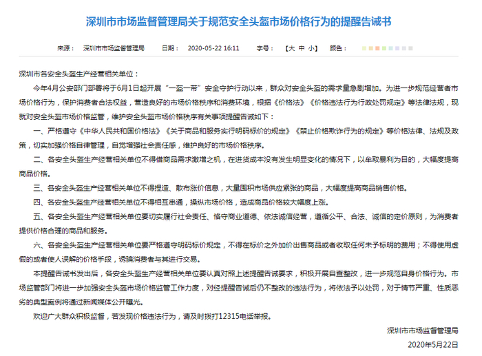 今年4月公安部门部署将于6月1日起开展“一盔一带”安全守护行动以来,群众对安全头盔的需求量急剧增加。为进一步规范经营者市场价格行为,保护消费者合法权益,营造良好的市场价格秩序和消费环境,根据《价格法》《价格违法行为行政处罚规定》等法律法规,深圳市市场监管局现就对安全头盔市场价格监管,维护安全头盔市场价格秩序有关事项提醒告诫如下: