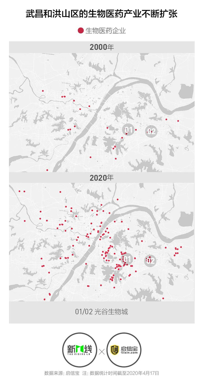 在2000年以前,武汉市区的生物医药企业在武汉三镇的发展较为均衡,武昌的企业数量略高,但是与汉口和汉阳差距不大。不过,武昌的光谷生物城经过十余年的发展,生物医药企业在此地逐渐聚集,培育出了更多的头部企业,并辐射到周边地区,形成了武汉生物医药发展的最高极。