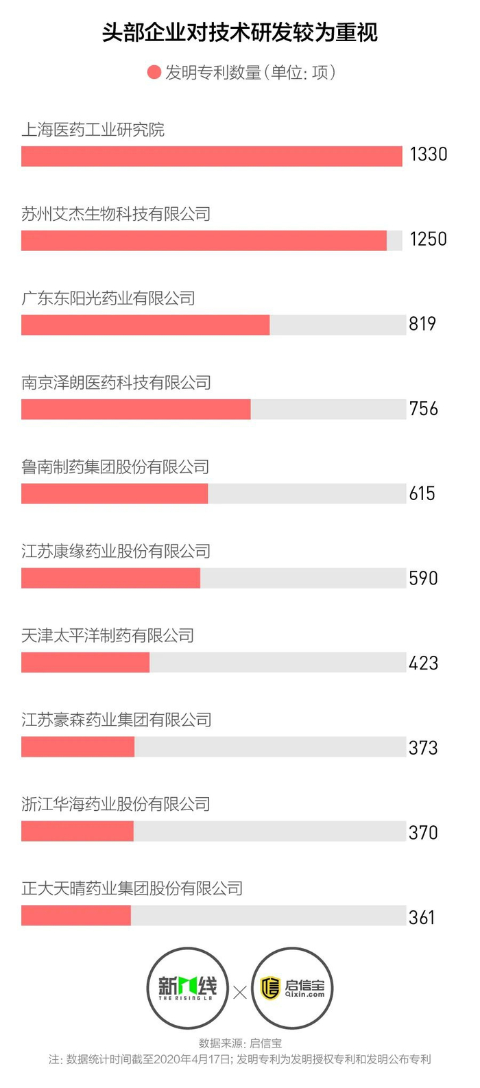 成熟的生物医药企业拥有完善的专利保护体系,通过专利保护、授权、转让促进研发创新,从而使企业持续保持新药品、器械的产出水平。苏州艾杰生物科技有限公司和广东东阳光药业有限公司,分别拥有1250和819个发明专利,是除了科研型企业上海医药工业研究院以外,发明专利总量最多的两家企业。