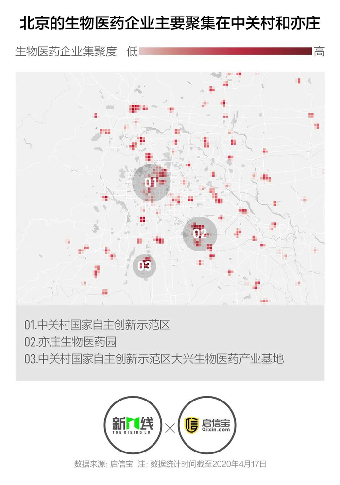 北京的生物医药企业以中关村国家自主创新示范区和亦庄生物医药园为中心,形成了两大主要集聚区。2006年整合进入中关村国家自主创新示范区的大兴生物医药产业基地,经过十余年的发展,也体现出了较强的集聚性。