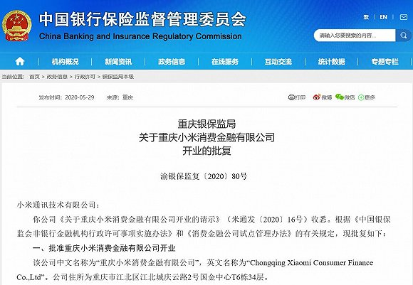 5月29日,重庆银保监局发布了《关于重庆小米消费金融有限公司开业的批复》(以下简称《批复》),并公布了公司股权结构、董事及高管名单、业务范围等重要信息。