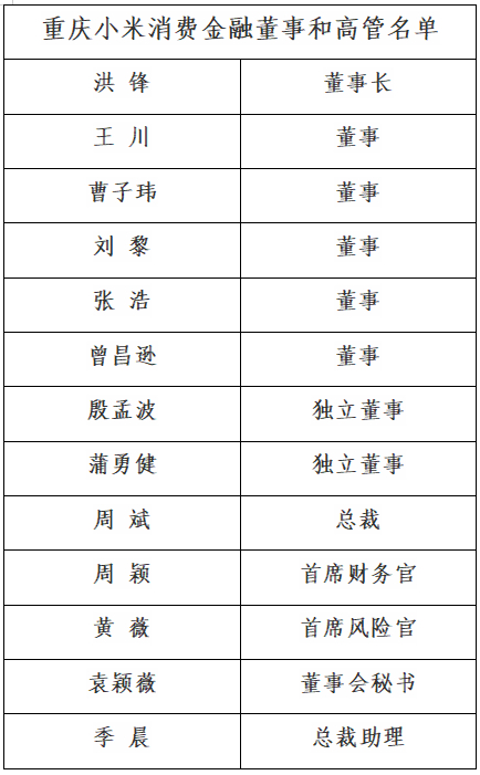 《批复》中还公布了重庆小米消费金融有限公司董事和高级管理人员任职资格。