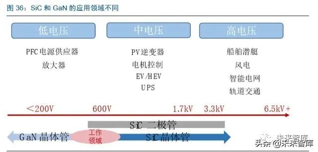 目前第三代半导体功率器件发展方向主要有 SiC 和 GaN 两大方向,SiC 拥有更高的热 导率和更成熟的技术,而 GaN 高电子迁移率和饱和电子速率、成本更低的优点,两者 的不同优势决定了应用范围上的差异,GaN 的市场应用偏向高频小电力领域,集中在 600V 以下;而 SiC 适用于 1200V 以上的高温大电力领域。
