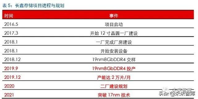 作为国产 DRAM 长跑竞赛的接棒人(第一棒为奇梦达),合肥长鑫存储自 2016 年立项 以来快速推进 DRAM 的研发与量产,2018 年年底即完成与国际主流 DRAM 产品同步 的 10nm 级、第一代 19nm 8GB DDR4 的交样,随后在 2019 年 9 月 20 日宣布 19nm 8GB DDR4 投产,一期目标产能达 12 万片/月。这标志我国在内存芯片领域实现量产技 术突破,拥有了这一关键战略性元器件的自主产能。