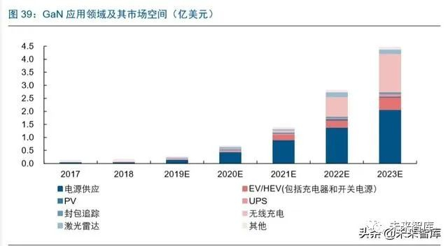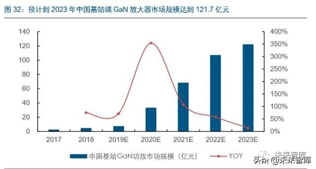 根据集邦咨询的研究数据表明,2018 年由于 5G 通信试验基站的建设,基站端 GaN 射 频器件市场规模达到 4.2 亿元;2019 年为中国 5G 建设元年,基站端 GaN 放大器同比 增长达 71.4%;预计到 2023 年中国基站端 GaN 放大器市场规模达到 121.7 亿元。