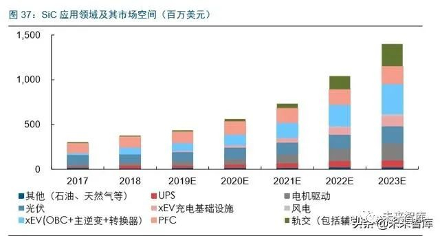目前,SiC 功率器件市场仍然主要受功率因素校正器(PFC)和光伏(PV)应用中使用 的二极管驱动。在电源 PFC 电路中使用碳化硅肖特基二极管,电源效率提高显而易见, 同时由于不再需要考虑软开关或无损吸收技术,缩短了电源的开发周期、减少了元件数 量、简化了电路结构,更为重要的是它减小了对周围电路的电磁干扰,提高了电源的可 靠性,使产品具有更高的竞争力。SiC 的出现符合未来能源效率提升的趋势,也是产业 链努力的结果,未来市场空间必将越来越大。根据 Yole 的统计及预测,2017 年全球 SiC 功率器件的市场空间为 3.02 亿美金,预计到 2023 年,SiC 功率器件的市场空间可以达 到 13.99 亿美金,对应 2017-2023 年复合增速达到 29%。