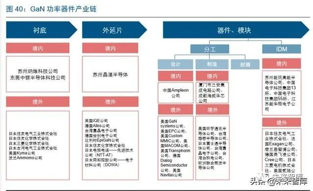 GaN 产业链包括上游的衬底和外延环节、中游的器件和模块制造环节以及下游的应用 环节。目前 IDM 厂商较多,包括德国英飞凌、美国 Cree、美国 Avogy、美国 Exagan 和日本三菱电机等。随着行业的发展,GaN 功率器件领域涌现了一批初创设计企业,与 拥有生产线的 IDM企业或代工厂合作开发 GaN 器件产品,如 EPC、Transphorm、GaN System 等设计公司已与 On Semi、富士通半导体、台积电、X-Fab 等代工厂达成合作 协议。