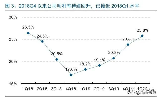 产品结构持续优化,成熟制程+先进制程驱动公司毛利持续上行。近两年中,自 2018 年 Q4 开始公司毛利率持续回升, 2020Q1 实现毛利率 25.8%,已接近 2018Q1 的 26.5%, 同比+7.6pct,环比+2.0pct。