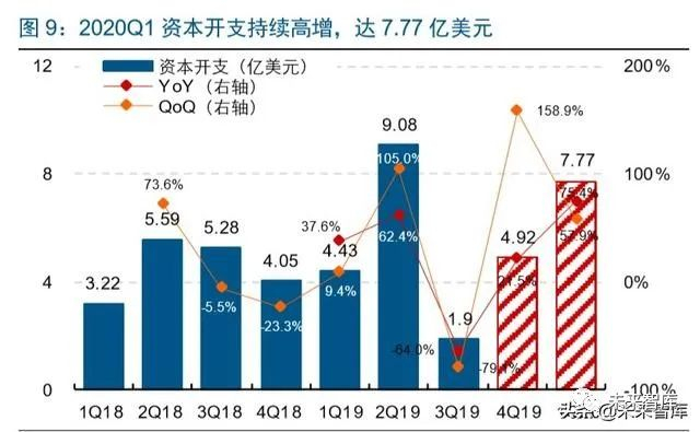下游需求强劲,公司信心充足。下游需求持续加强为公司进行扩产带来充足动力,公司 2020Q1 资本开支延续 2019Q4 增长态势,达 7.77 亿美元,同比+78.4%,环比+57.9%。半导体制造公司产能与对下游需求的判断高度关联,基于 2020Q1 成熟制程产能满载, 先进制程工艺推进顺利,在通信、手机、汽车、消费电子等领域应用持续拓展,公司对 未来充满信心,将 2020 全年资本开支计划上调 11 亿美元至 43 亿美元,预计较 2019 年的 20 亿美元增长 115%。