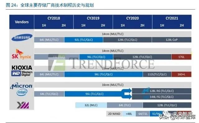 三星于 2019 年 6 月推出 128 层 TLC 3D NAND 并于 8 月量产;同时三星正在开 发 160 层或更多层的第 7 代 V-NAND Flash;