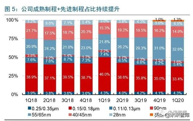 成熟制程产能满载,先进工艺研发顺利。受益于摄像头、电源管理 IC、指纹识别、特殊 存储等应用需求强劲,公司成熟制程和先进制程占比持续提升。2020Q1 公司 55/65nm 制程产品占比同比+10.8pct,环比+1.6pct;28nm 制程产品同比+3.5pct,环比+1.5pct;14nm 制程产品同比+1.3pct,环比+0.3pct。
