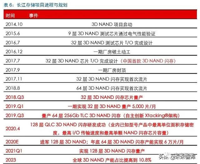 长江存储起步较晚,NAND FLASH 进展迅猛。2020 年 4 月 13 日,长江存储宣布业内 首款 128 层 QLC3DNAND 闪存(X2-6070)研发成功,且已在群联和联芸两家控制器 厂的 SSD 上通过验证,而这距 32 层 3DNAND 完成设计仅过去不到 3 年。长江存储在 2016 年成立之初产品仅为 32 层 3DNAND Flash,跟全球顶级厂商的差距约为 4-5 年 (彼时三星已实现 64 层产品量产);2018Q3 32 层 3DNAND Flash 实现量产,一年后 2019Q3 64 层 3DNAND Flash 实现量产(彼时三星已于一年前实现 96 层产品量产) , 随后长江存储跳过 96 层直接研发 128 层 3DNAND Flash,跻身全球前沿技术队列,技 术实力突破速度持续增加。
