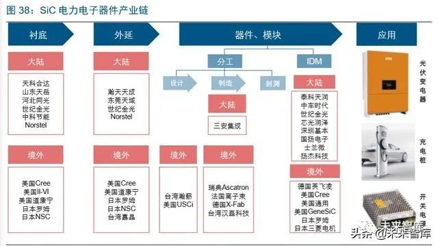 类似于集成电路的制造,SiC 器件的生产也已经开始出现分工,但目前仍以 IDM 模式为 主。SiC 产业链包括上游的衬底和外延环节、中游的器件和模块制造环节以及下游的应 用环节。由于功率半导体的投资额较硅半导体要低,IDM 厂商较多,包括德国英飞凌、 美国 Cree、美国通用、日本 Rohm 和日本三菱电机等。其中值得一提的是同样涉足 LED 产业的 Cree,拥有多年碳化硅衬底生产经验,并且其旗下的 Wolfspeed 是全球领先的 射频与功率器件公司,拥有垂直一体化的生产能力。但由于大陆与台湾地区企业的进入, 近年来专业分工模式也在增多,代工企业包括大陆的三安集成、瑞典 Ascatron、法国离 子束、德国 X-Fab 以及台湾地区的汉磊科技等。