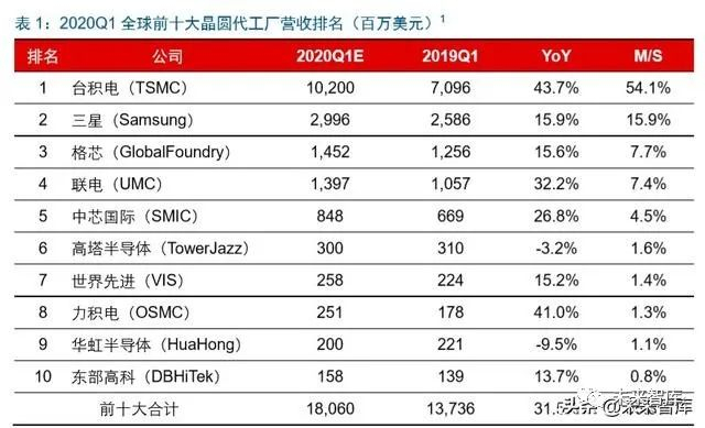 根据集邦咨询旗下拓墣产业研究院分析,2020 年第一季晶圆代工厂的营收排名中,中 芯国际排名行业第五位,预计市场占有率为 4.5%。